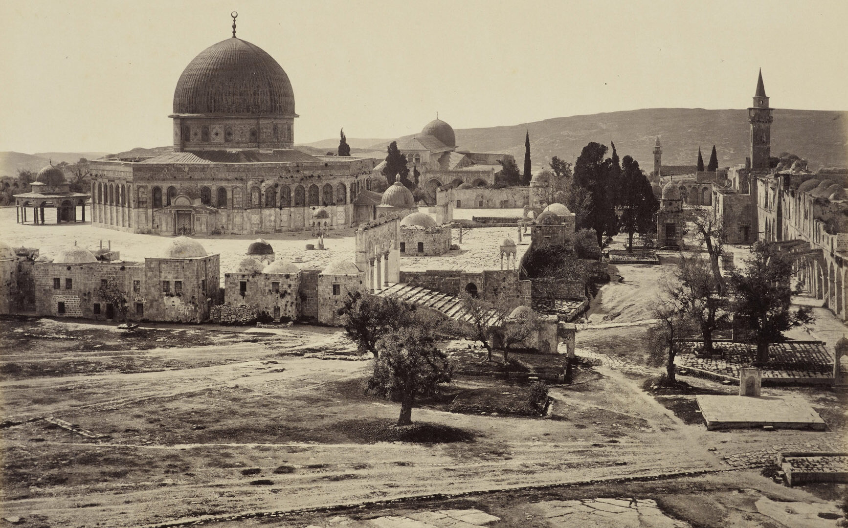 It does seem that the city and its environs is trapped in some darkly humorous divine drama. Without any convincing physical proof that a Temple of Solomon ever existed, when the conquering Arabs took the city, they built a sanctuary—haram—on the site of the Jewish Temple to affirm their power vis-à-vis the Christians (the main population of the city then) and the Jews, although the latter were not much of a presence in the city at that time. The Umayyad caliph Abdel al-Malik who built the Dome of the Rock in 692 had an additional motive: He wanted the new sanctuary to be the site of pilgrimage and counter his rival Abdellah ibn al-Zubayr in Arabia who wanted the honor to go the ka`ba (the name of common shrines in the region) in Mecca.